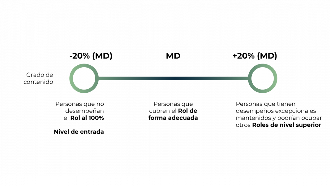 Tomando como referencia este resultado, se establecen los límites mínimos (-20%) y máximos (+20%) de cada uno de los grados de contenido, y se divide la dispersión existente entre el -20% y el +20% en 9 niveles, de forma que las personas puedan promocionar retributivamente sin necesidad de variar el contenido del rol de acuerdo con su experiencia, desempeño y potencial.