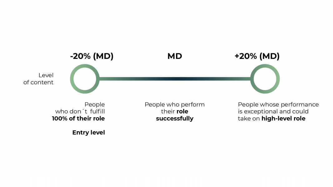 Based on this result, minimum (-20%) and maximum (+20%) limits are established for each content grade, and the dispersion between -20% and +20% is divided into nine levels so that individuals can be promoted in terms of remuneration without having to change the content of their role according to their experience, performance, and potential.